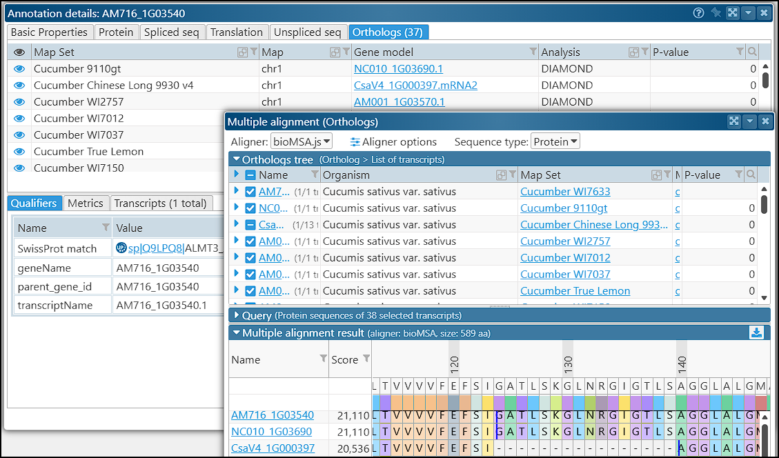 The orthologous proteins for each gene can also be studied in multiple alignment interface available through the gene properties form: