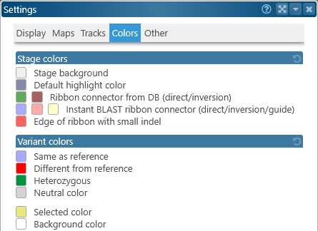- Stage colors: Lists the colors for most of the items in the main view: background, track highlights, connectors, and the Instant BLASTN ribbons.