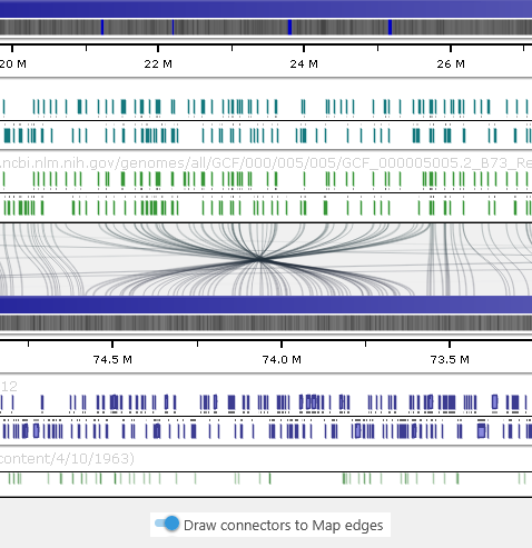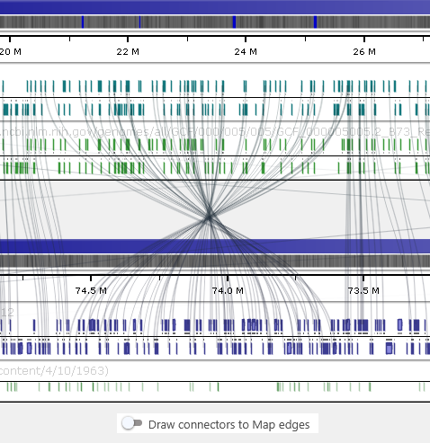 The controls in this section apply to connectors between maps, such as orthologs or syntenic ribbons. You may find it useful to toggle some of these connectors on and off to reduce visual clutter, or to generate a more informative screenshot for publication.