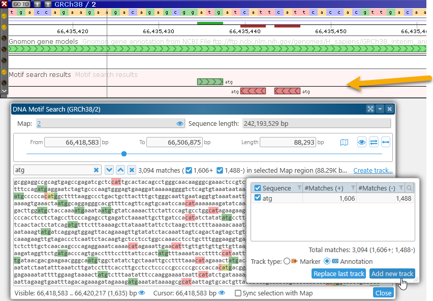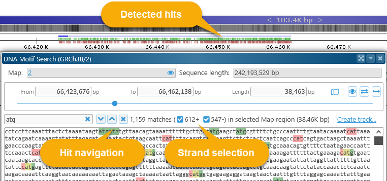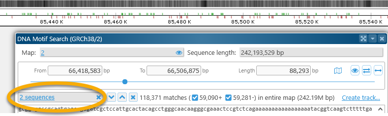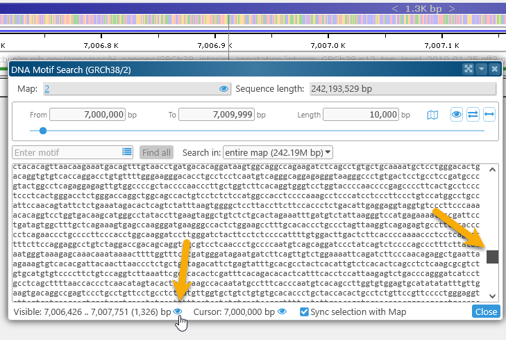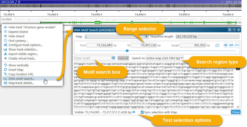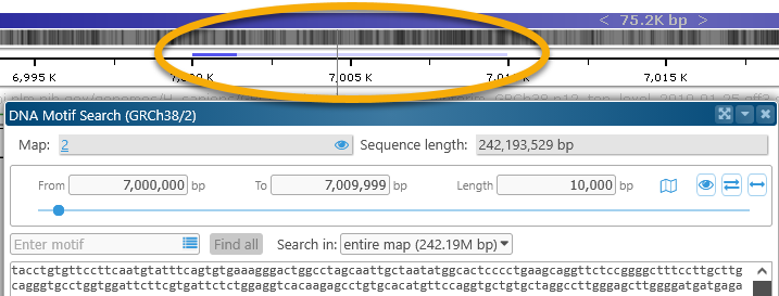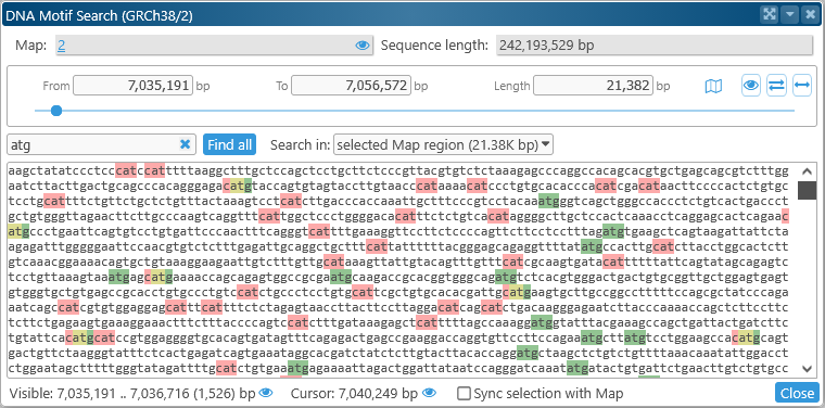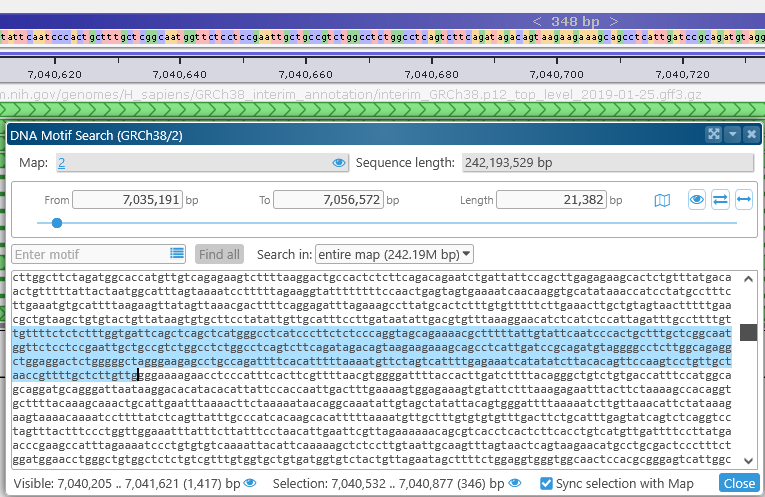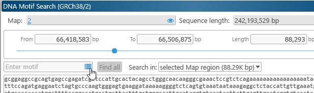This dialog displays the DNA sequence of the currently visible map region. For now, the maximum allowed region length for motif search is 2Mbp; if the currently visible region on the map is longer than that, the range will be clipped to 2Mbp.