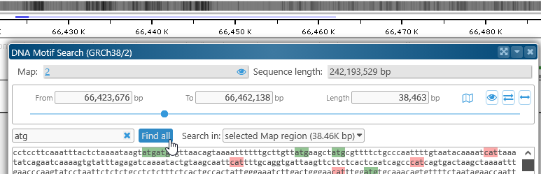 To reveal all of the matches on the map, click the Find all button. By default, Persephone will only search for the motif in the currently selected region, as specified in the Search in dropdown box: