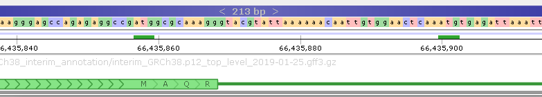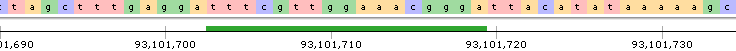 All of the matches are displayed in small sub-track above the Ruler; as usual, you can zoom in to the individual nucleotide level to examine the hits in more detail:
