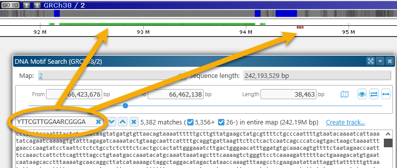 You can also change the Search in dropbox to entire map to find a motif of interest anywhere on the map, not just in the selected region (although doing so may take some time). For example, you can look for the centromere motif on the entire Human Chromosome 2: