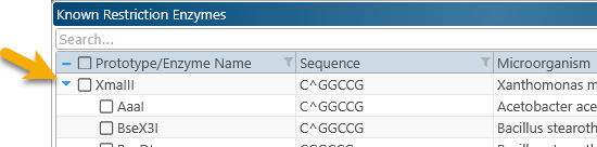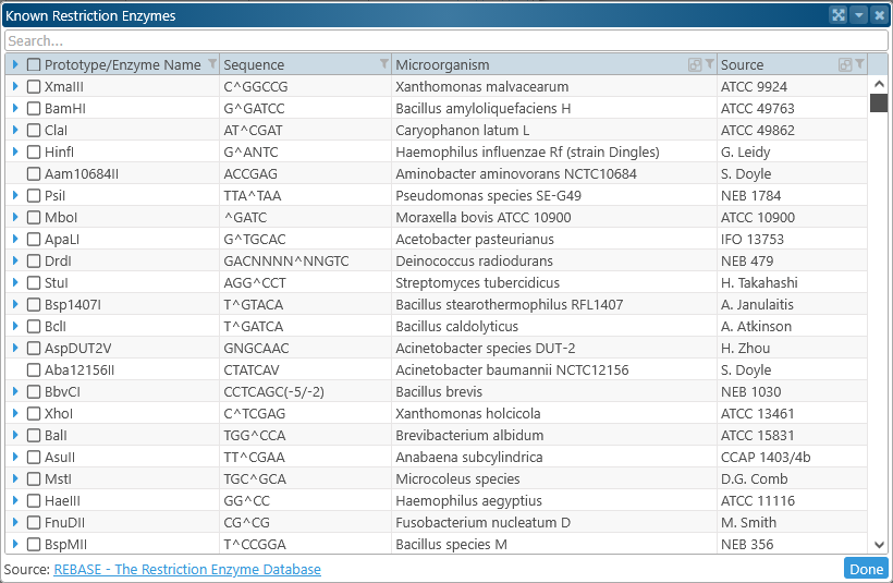 button in the search box to open the Known restriction enzymes table: