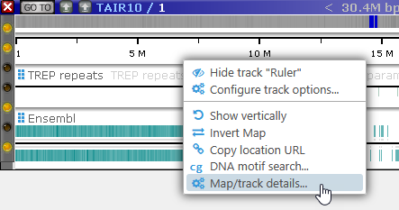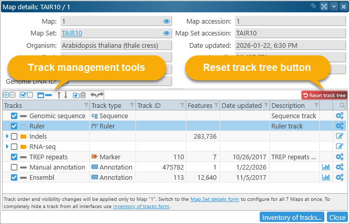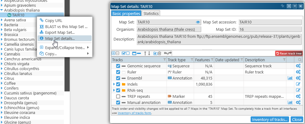 Each map in a Map Set possesses its own track positions, visibility, and collapsed/expanded states. This means that e.g. rearranging tracks on Chromosome 1 will not affect their positions on Chromosome 2 of the same organism. To manage tracks on all maps in the Map Set simultaneously, right-click the Map Set in the Map Set tree, and select Map Set details from the popup menu: