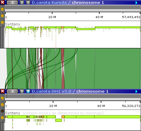 In Persephone, if identical markers are found on two maps displayed on screen, they are automatically linked by a connector line. Orthologous genes are also linked by connector lines, and syntenic blocks are linked by ribbons: