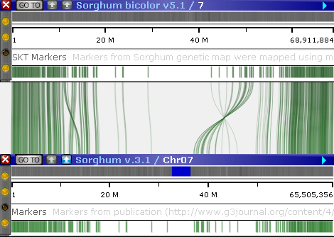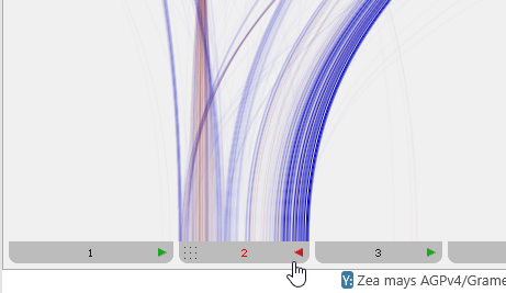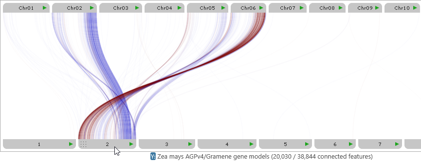 In this mode, connectors between track features (such as orthologous genes or common markers) are shown as dots on the plot. For example, you could display a dot plot of all known orthologs between Sorghum (Sorghum v.3.1) and Corn (Zea mays AGPv4):
