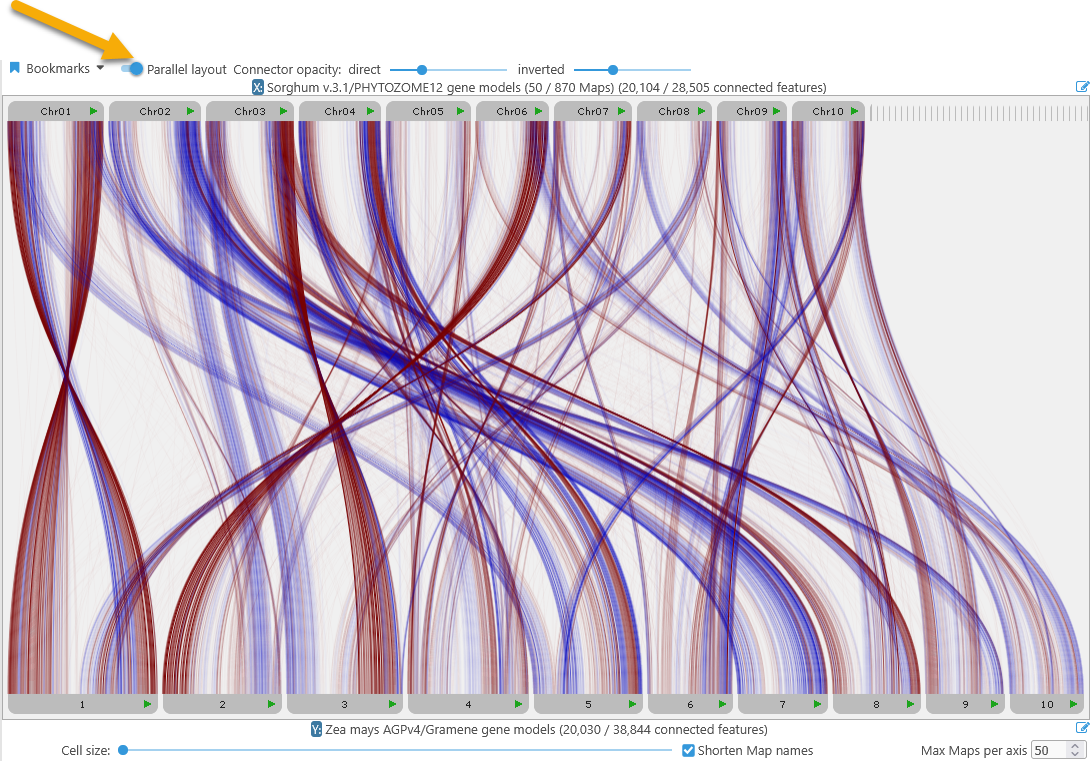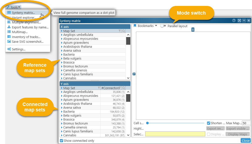 The Synteny Matrix tool visualizes these connections in a more compact way, either as a dot plot or as a parallel plot of all connected maps.