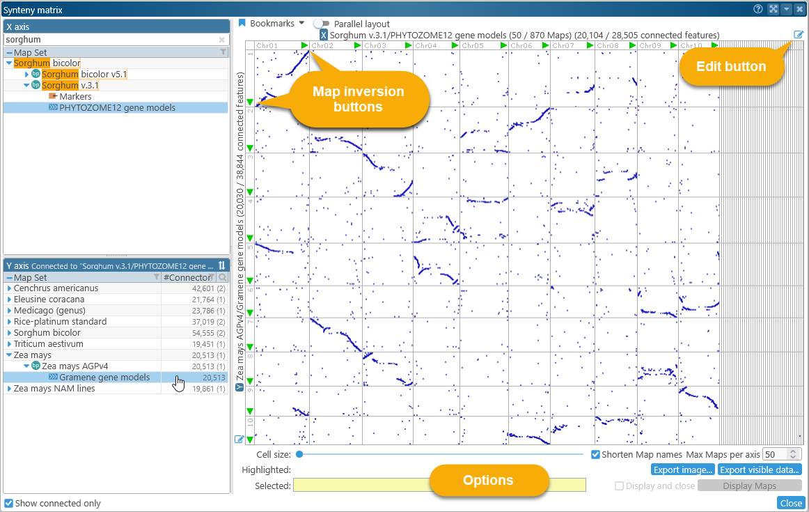 In this example, 12 out of 870 maps in the map set Sorghum v.3.1(track PHYTOZOME12 gene models), contained orthologs to the Corn map set selected on the Y-axis (in this case, Zea mays AGPv4 (track Gramene gene models). Of the total 40,617 annotations, 20,686 had orthologs in Corn. You can mouse over any cell in the dot plot to see the number of connectors it contains; the cell will be highlighted in yellow, and its name and connector count will be displayed in the Highlighted field at the bottom of the dialog: