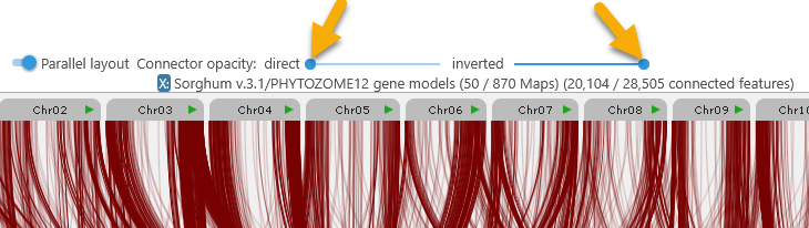 Direct connectors (i.e. those between track features or syntenic blocks on the same strand) are shown in blue; inverted connectors are shown in red. You can use the connector opacity sliders at the top to make either group of connectors more transparent; for example, you could de-emphasize direct connectors and emphasize inverted ones: