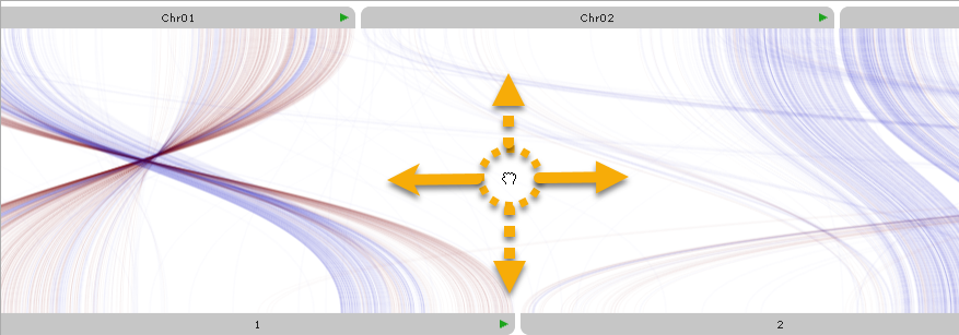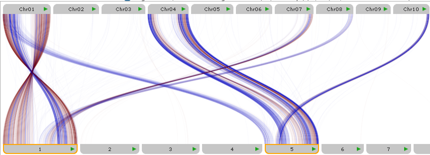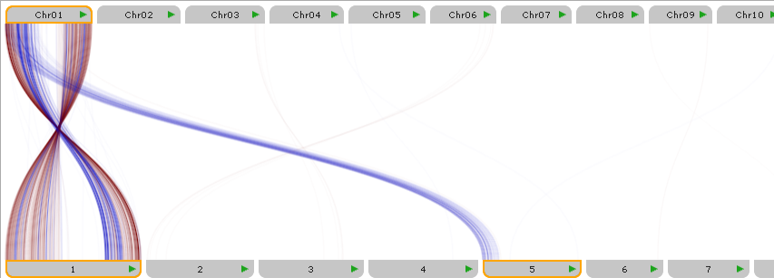 Pin maps on both sides of the plot to further filter down the displayed connectors. For example, you could additionally pin Chr01 of Sorghum (at the top of the plot), to show only the connectors between Sorghum's chromosome 1, and Corn's chromosomes 1 and 5: