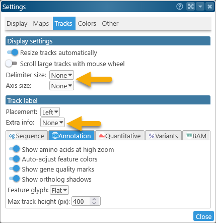 To show or hide transcript labels on the Annotation track, right-click anywhere inside it, then choose Configure track options from the popup menu to open its Configure Track dialog. In this dialog, you can choose the qualifier whose value will be used for the label: