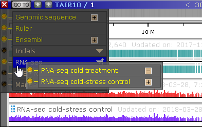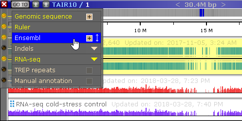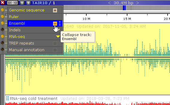 button to collapse the track again. Most tracks only display summary information when collapsed; for example, the Annotation Track (pictured above) displays a histogram of transcripts when collapsed, and a full transcript pile-up when expanded.