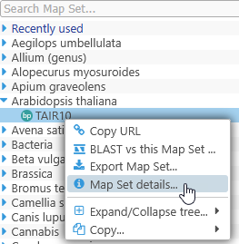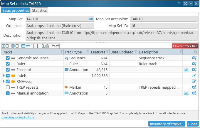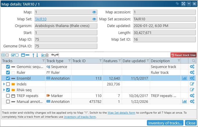 Each map will "remember" the status of every one of its tracks, including each track's order on the map; whether the track is visible or hidden; and whether it is collapsed. For example, if you hide the "Ensembl" track on Chromosome 1 of , this track will be hidden only on Chromosome 1. If you open Chromosome 2, the track will be visible on that map. However, you can manage all tracks for a Map Set in bulk from the Map Set details dialog. You can bring up this dialog by clicking the Map Set name: