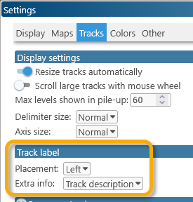 You can control the placement of the label and the extra information line. To do so, open the Settings dialog, and select the Tracks tab: