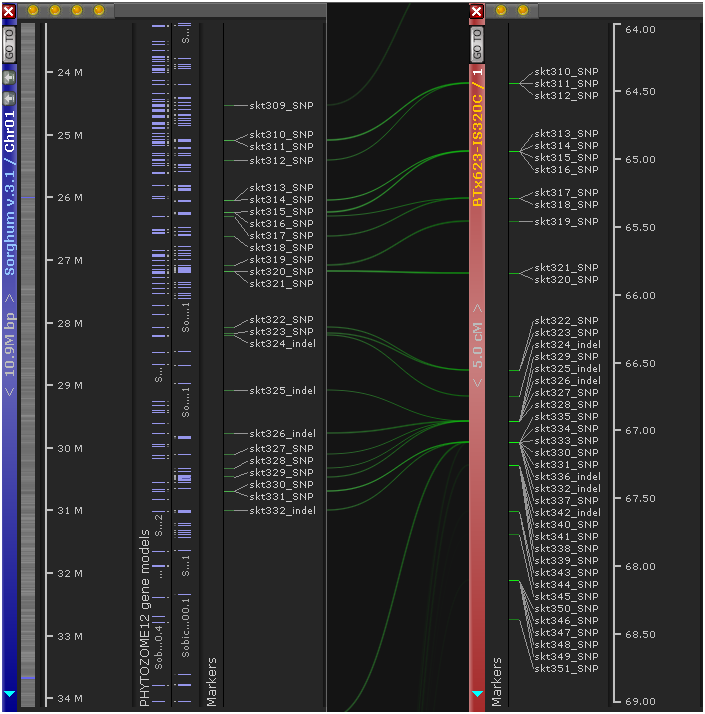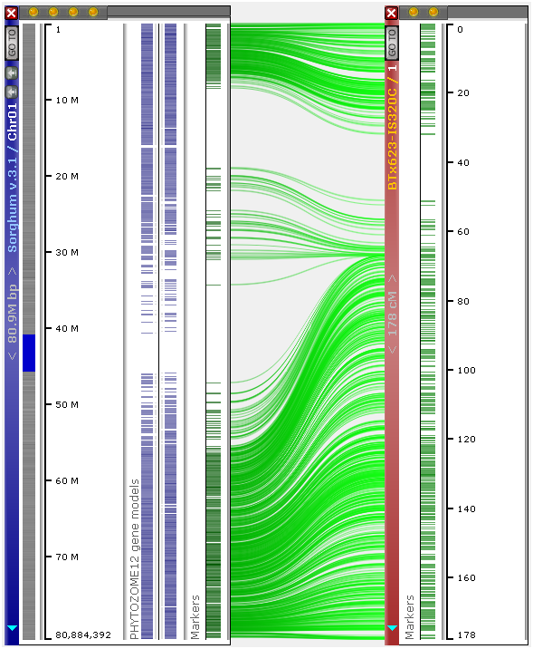 3: The Sequence alignment buttons: When two maps are displayed side-by-side, performs instant alignment of their genomic sequences and displays the result as ribbons connecting the two maps.