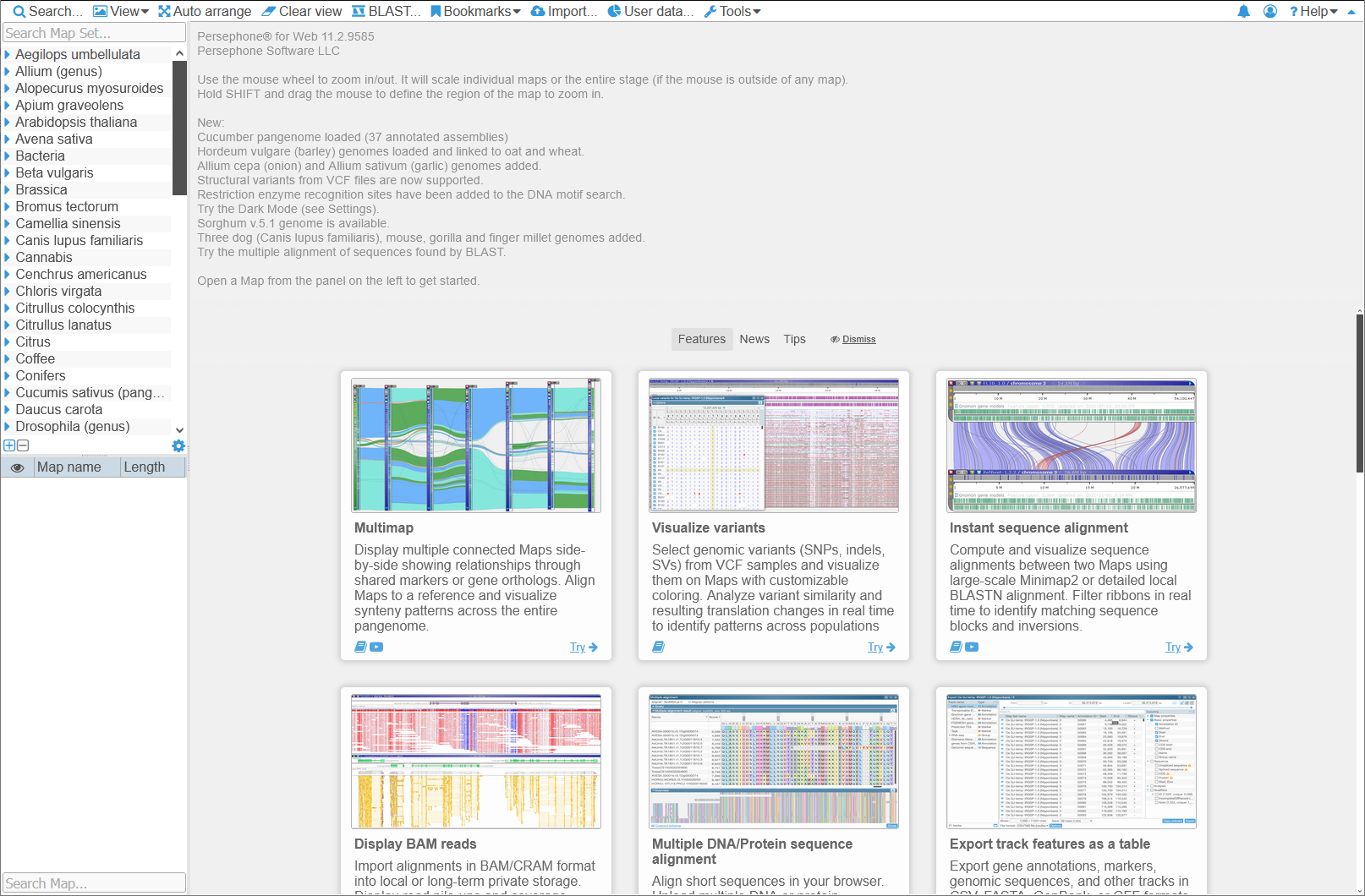 Persephone is a tool for visualizing genomic information, enabling free exploration of large volumes of data -- including physical and genetic maps, genomic sequences, gene models, synteny, sequence variants (SNPs and indels), quantitative tracks such as RNA-seq and methylation, and many others. The application is designed to work with multiple maps on screen enabling users with ability to align and compare these maps.
