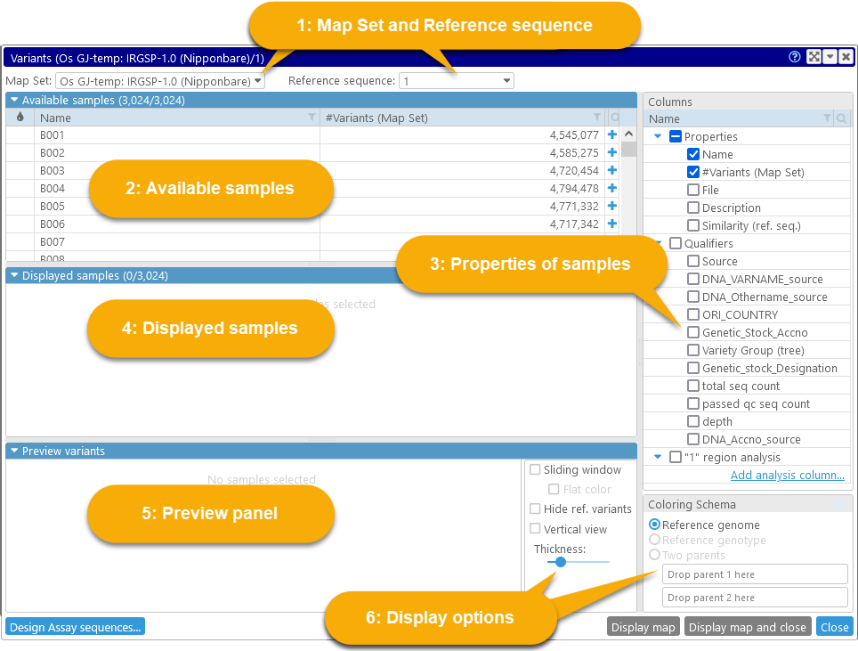 1: The Map Set and Reference sequence dropdown boxes at the top list all Map Sets with available variant samples, and the list of available sequences for the currently selected Map Set (e.g. its chromosomes).