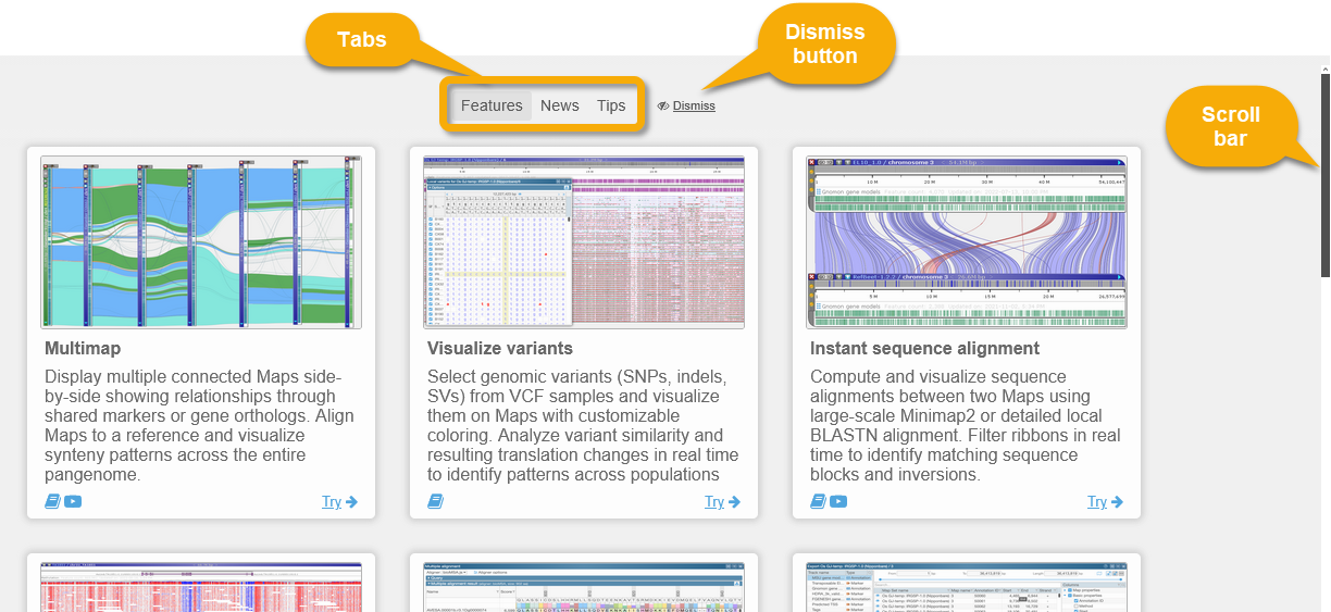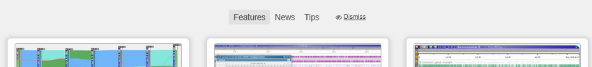 By default, the Features tab is selected, displaying an overview of Persephone's main features. Click the News or Tips tabs to switch to other content, or click the Dismiss button to close the tiles. To scroll the tiles, place your mouse over them and roll the mouse wheel, or use the scroll bar on the right-hand side.