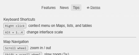 This tab displays a list of useful keyboard and mouse shortcuts, as well as some other user interface tips.
